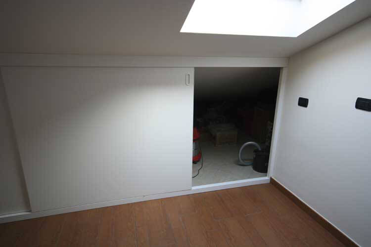 All’inizio abbiamo delimitato lo spazio, con l’adozione di una parete in cartongesso, predisposta per un portale di ingresso a due antine battenti,che utilmente ha reso lo spazio ben delineato, di facile accesso e ben attrezzabile. Successivamente abbiamo pannellato le tre pareti, con pannelli in nobilitato chiaro, color magnolia, corredati di aste “a cremagliera” in alluminio, funzionali per l’aggancio dei ripiani, tramite i relativi supporti metallici. I ripiani (6 pezzi) sono stati attrezzati con un tubo appendiabiti ciascuno,cosi’ da permettere di riporre una notevole quantita’ di capi d’abbigliamento, come giacche, cappotti, abiti uomo, tailleur e quant’altro, con la possibilita’ di regolare in altezza i ripiani, modulando lo spazio in base alle esigenze. Per un effetto di contrasto, i ripiani sono stati realizzati in laminato color rovere moro. Completate le due pareti appenderia, abbiamo inserito un ampio specchio, utile nella fase di vestizione. Con questa realizzazione su misura,abbiamo ricavato un pratico contenitore, che completa una camera matrimoniale, dove non era possibile nemmeno realizzare un armadio su misura. Successivamente siamo intervenuti in un locale attiguo, sempre in mansarda, con l’esigenza di chiudere uno spazio molto basso, rivolto verso la gronda,realizzando un telaio con due ante scorrevoli, inlaccato bianco opaco,organizzando lo spazio in due settori : a sinistra abbiamo inserito un elemento contenitore, in nobilitato bianco, tagliato sotto la falda inclinata del soffitto, molto profondo, che con le altezze disponibili permette di appendere dei capi d’abbigliamento e posteriormente, con dei ripiani, di riporre scatole e scatoloni vari. A destra invece semplicemente si e’ ricavato l’accesso allo spazio rimanente, piuttosto ampio, anche se penalizzato dall’altezza ridotta,ottenendo un ripostiglio sempre utile in ambienti poco spaziosi.