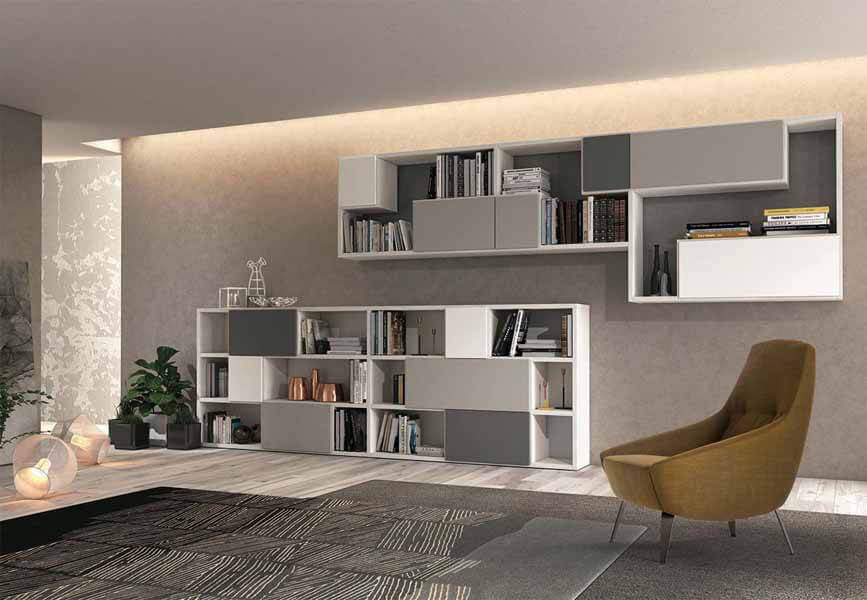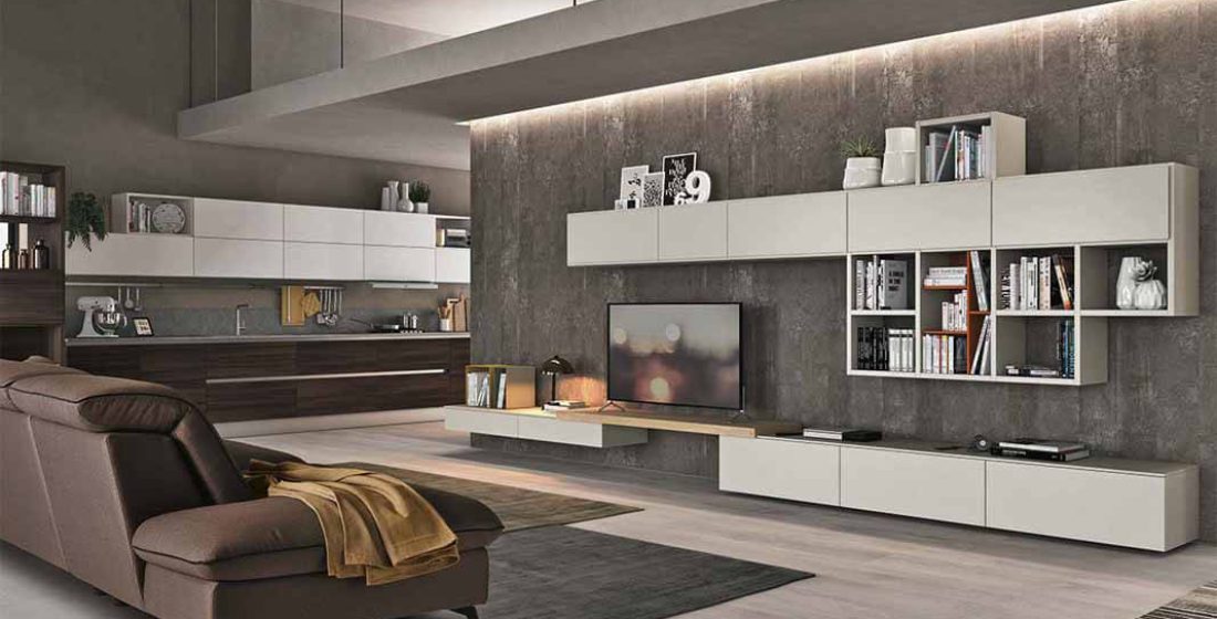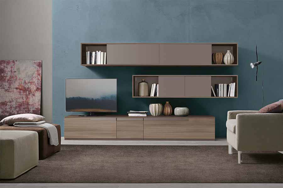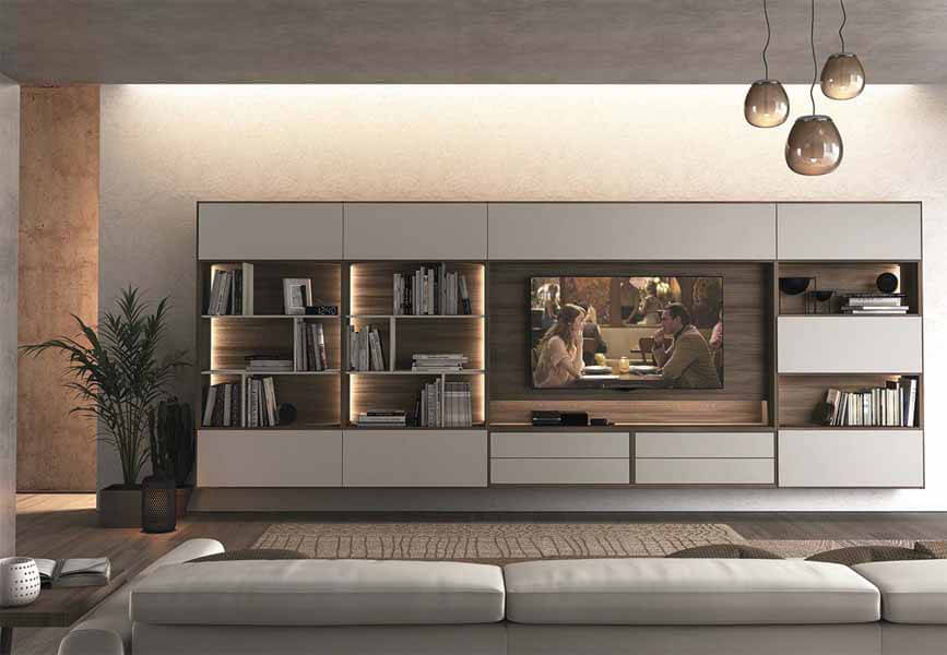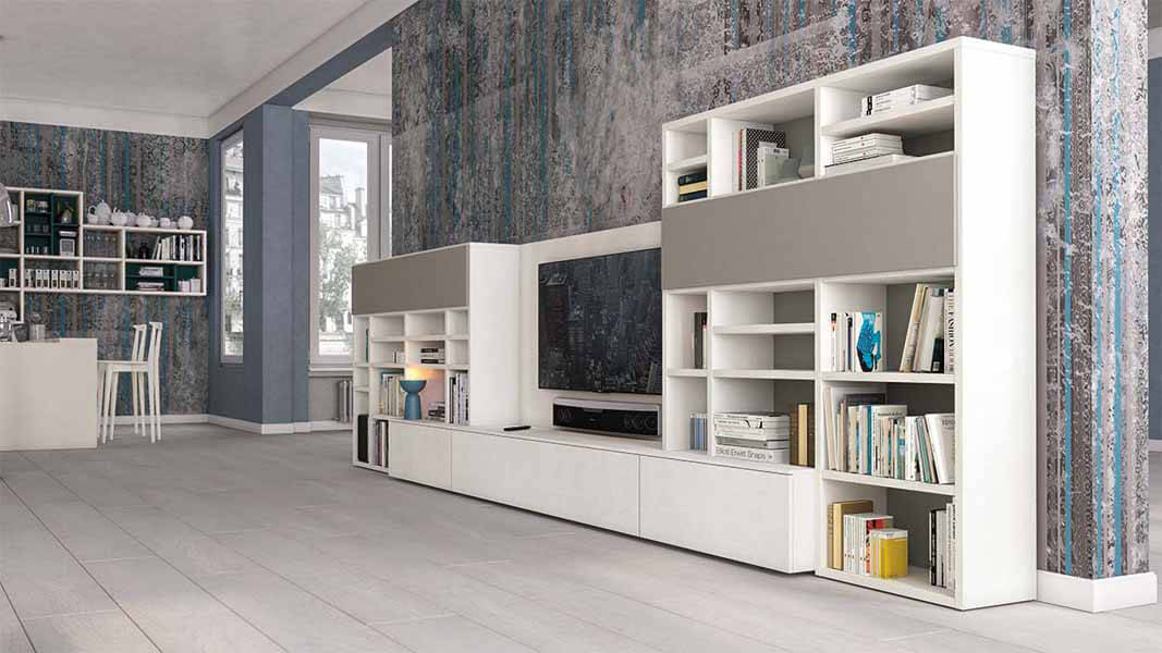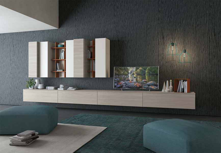 I moduli a terra,sospesi a parete, i pensili e le colonne laterali a giorno, con funzione libreria, sono gli elementi determinanti nella composizione di una parete soggiorno.