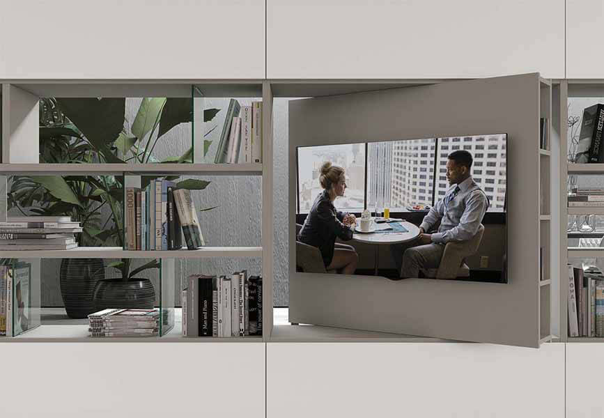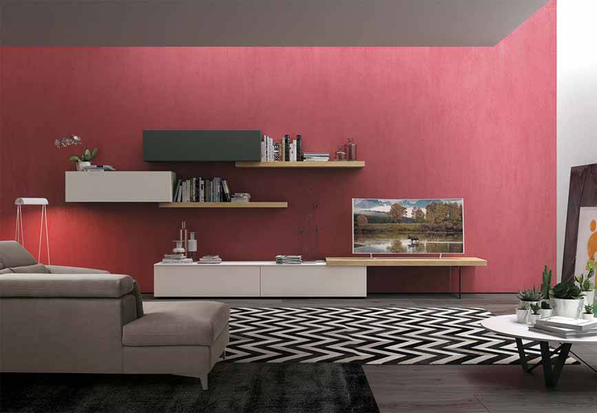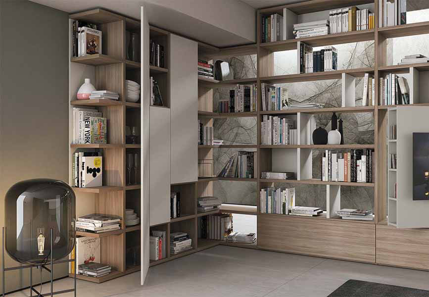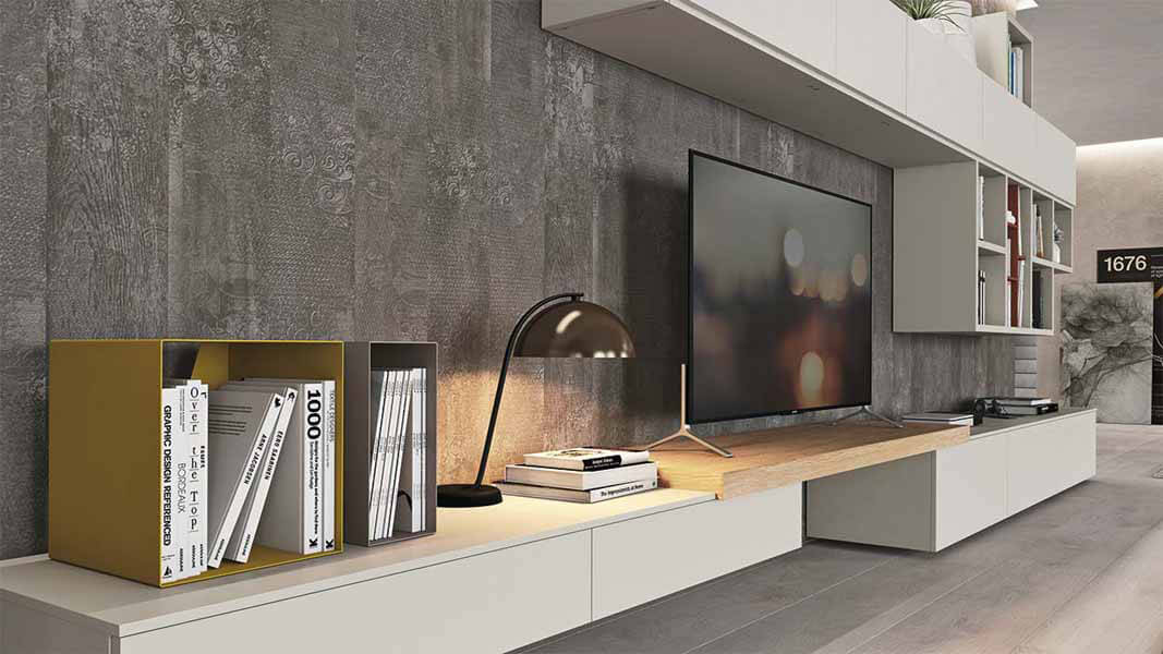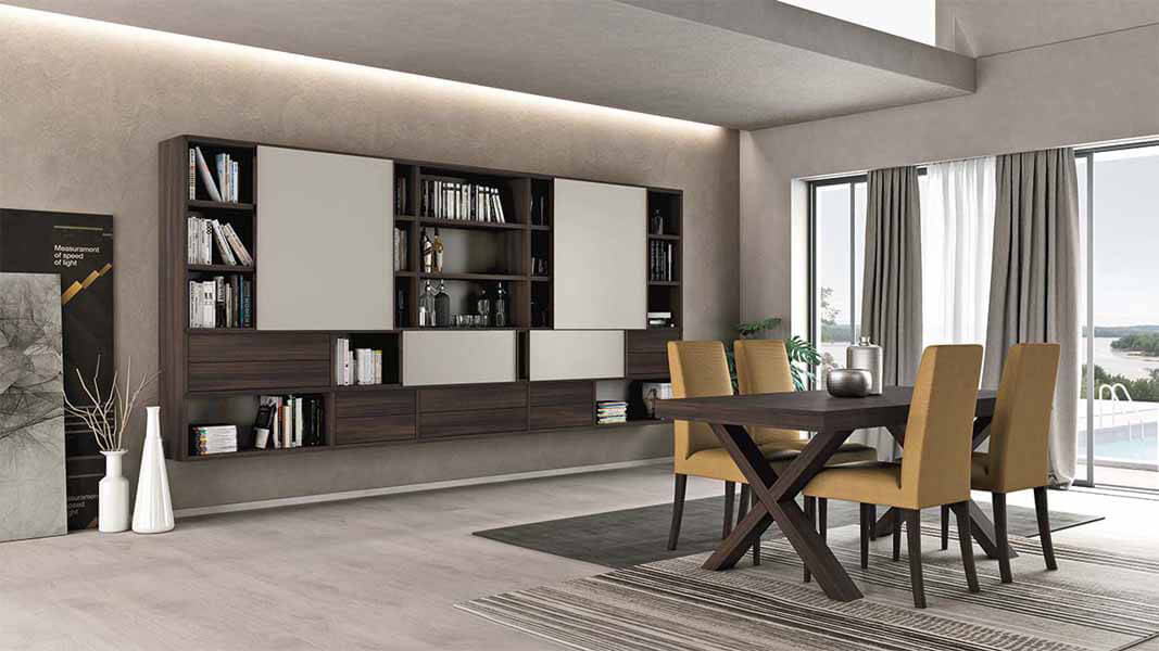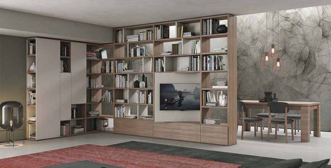 I moduli a terra,sospesi a parete, i pensili e le colonne laterali a giorno, con funzione libreria, sono gli elementi determinanti nella composizione di una parete soggiorno.